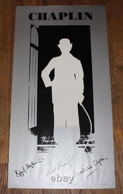 Vintage poster from the 1992 film "Chaplin". Previously owned with light distress from storage, has some edge wear etc. Numbered second edition with what looks like printed signatures from Robert Downey, Jr. Geraldine Chaplin, and Richard Attenborough. Please refer to enlarged zoom photographs for distress details.